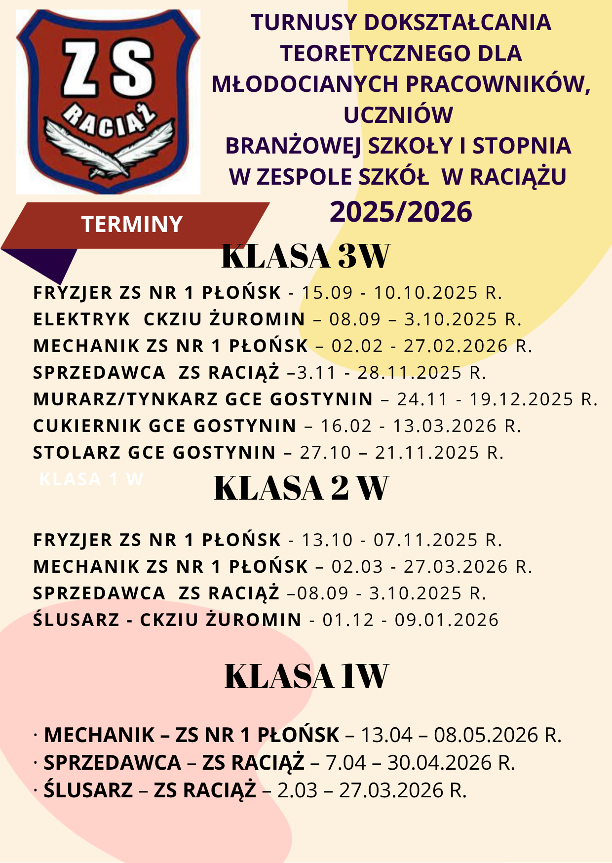 Terminarz turnusów organizowanych w ZS w Raciążu 2025/2026: